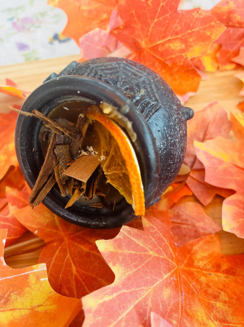 Cauldron candle, orange spice scent . Autumn Decoration | Fall Witchy halloween candle crackling wick