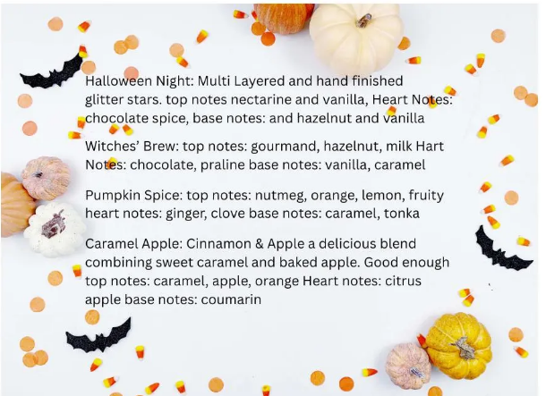 Halloween Night: Multi Layered and hand finished with glitter stars. top notes nectarine and vanilla, Heart Notes: chocolate spice, base notes: and hazelnut and vanilla.